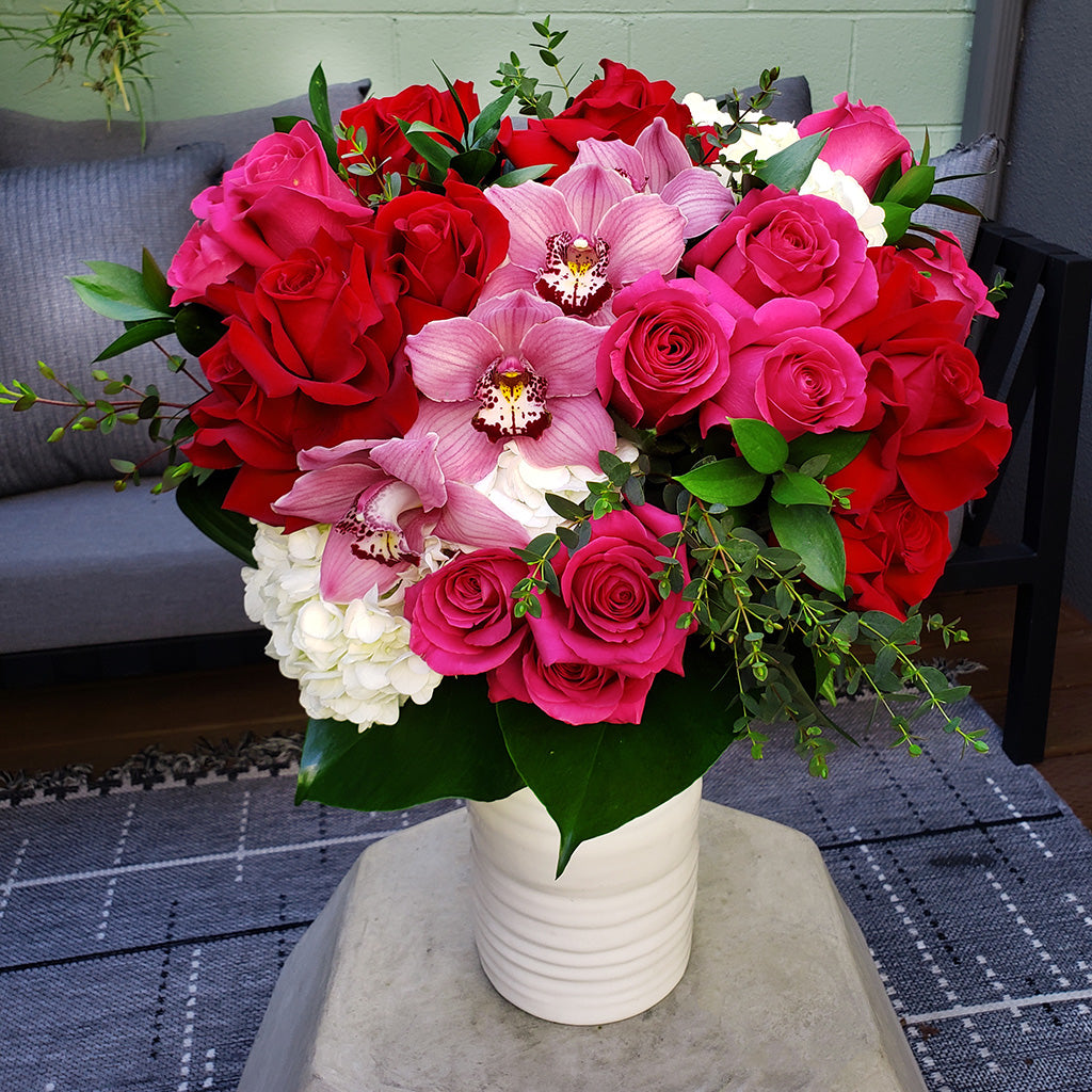 A collection of Designs that Feature the dominant color "Red"(along with shades of pink, white, & cream)- representingdesire, strength, and passionate love. With beauty, courage and heat as its symbolism, it's no surprise that a bouquet filled with rich, red blooms knows no restraint.
