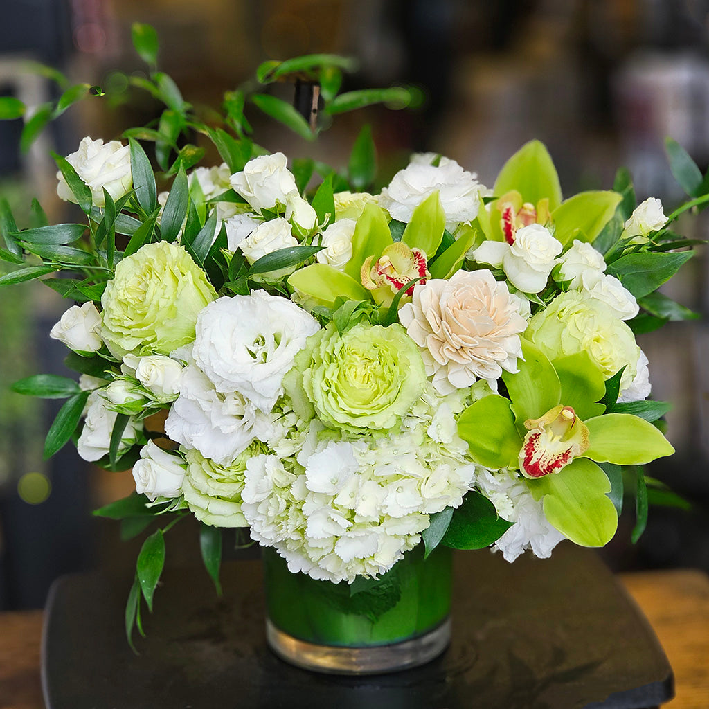 A loosely flowing design of white & green blooms of roses, hydrangea and orchids accented by greenery and a soft wood flower.